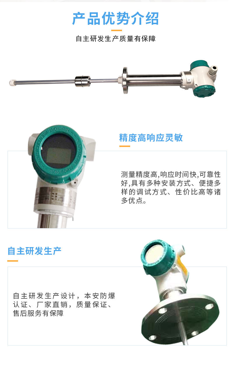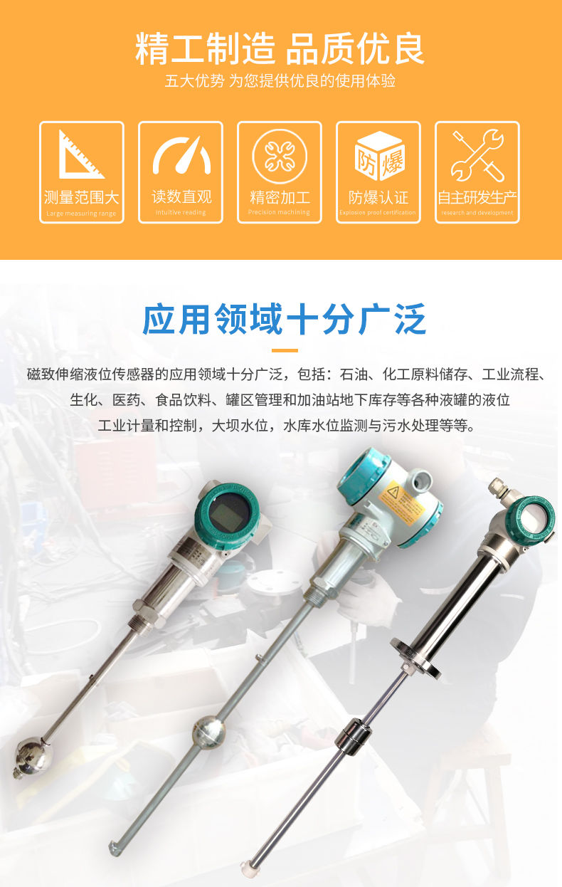 3.安全性好:磁致伸縮液位計(jì)的防爆性能高,本安防爆,使用安全,特別適合對(duì)化工原料和易燃液體的測(cè)量。測(cè)量時(shí)無需開啟罐蓋,避免人工測(cè)量所存在的不安全性。