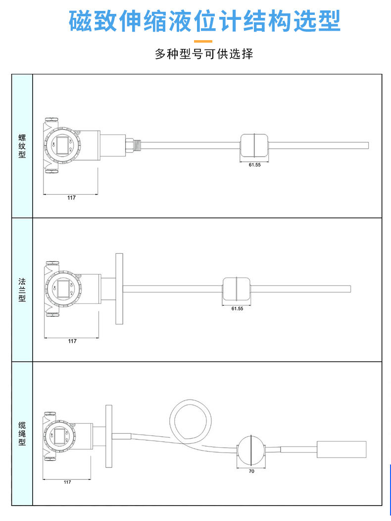 1.可靠性強(qiáng):由于磁致伸縮液位計(jì)采用波導(dǎo)原理,無機(jī)械可動(dòng)部分,故無摩擦,無磨損。整個(gè)變換器封閉在不銹鋼管內(nèi),和測(cè)量介質(zhì)非接觸,傳感器工作可靠,壽命長(zhǎng)。