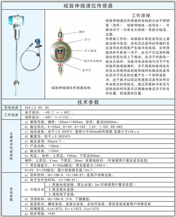 磁致伸縮液位傳感器的結(jié)構(gòu)部分由不銹鋼管(測桿)、磁致伸縮線(波導(dǎo)絲)、可移動浮子(內(nèi)有永久磁鐵)等部分組成,見圖。傳感器工作時,電路部分將在波導(dǎo)絲上激勵出脈沖電流,該電流沿波導(dǎo)絲傳播時會在波導(dǎo)絲的周圍產(chǎn)生脈沖電磁場。在傳感器測桿外配有一浮子,此浮子可沿測桿隨液位的變化而上下移動。在浮子內(nèi)部有一組永久磁環(huán)。當脈沖電流磁場與浮子產(chǎn)生的磁環(huán)磁場相遇時,浮子周圍的磁場發(fā)生改變從而使得由磁致伸縮材料做成的波導(dǎo)絲在浮子所在的位置產(chǎn)生一個扭轉(zhuǎn)波脈沖,這個脈沖以固定的速度沿波導(dǎo)絲傳回并由檢出機構(gòu)檢出。通過測量脈沖電流與扭轉(zhuǎn)波的時間差可以精確地確定浮子所在的位置,即液面的位置。