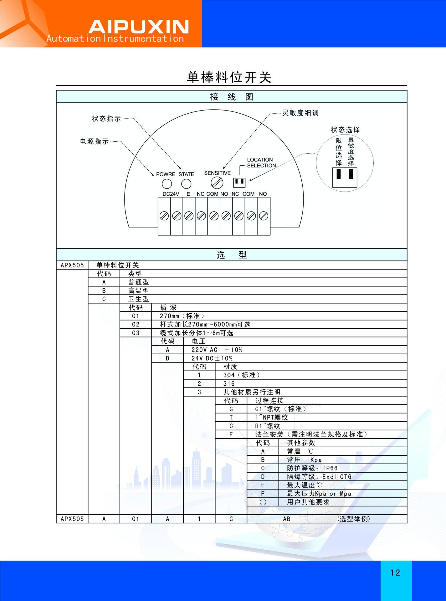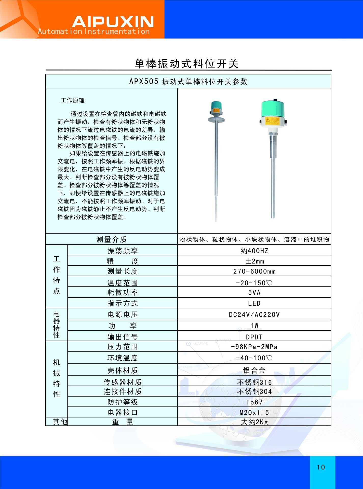 單棒式振動物位開關(guān)是通過壓電晶體的諧振來引起其振動的,當(dāng)受到物料阻尼作用時,振幅急劇降低且頻率和相位發(fā)生明顯變化,這些變化會被內(nèi)部電子電路檢測到,經(jīng)過處理后,轉(zhuǎn)換成開關(guān)信號輸出。該產(chǎn)品可以對料罐的高低位進行檢測、控制和報警,適用于各種液體、粉末、顆粒狀固體。它實用簡單、運行可靠、適用性強基本上是免維護的、音叉和輸出均有工作狀態(tài),均用發(fā)光二極管指示,可依據(jù)習(xí)慣調(diào)整狀態(tài)指示,并配有三種輸入方式(直流24V、交流110V和交流220V)和多種輸出方式(直流電流輸出型、繼電器接點輸出型、直流電壓輸出型)。所有類型均有高或低故障報警模式和可選擇的儀表開關(guān)靈敏度。