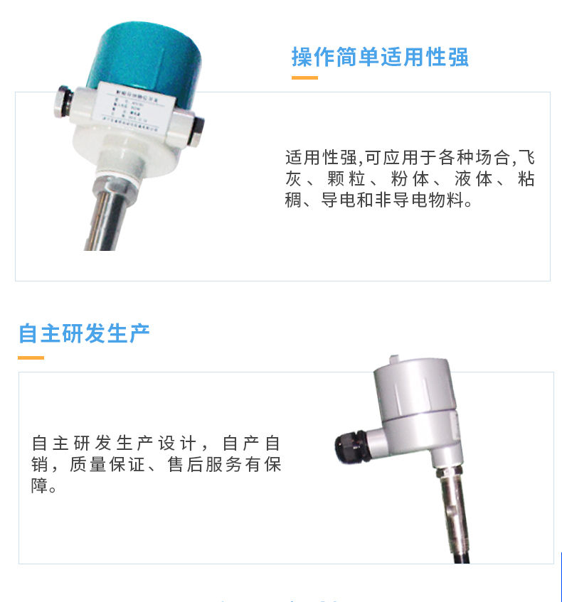 射頻導(dǎo)納開關(guān)采用智能微處理器元件及差值測量技術(shù),可以測量水,油漆,污水,泥漿,等液體,小麥,稻谷,沙子,水泥,金剛砂,玻璃,金屬粉,等粉料尤其是可有效精確的測量強腐蝕性介質(zhì),可對環(huán)境變化和掛料進行動態(tài)補償。