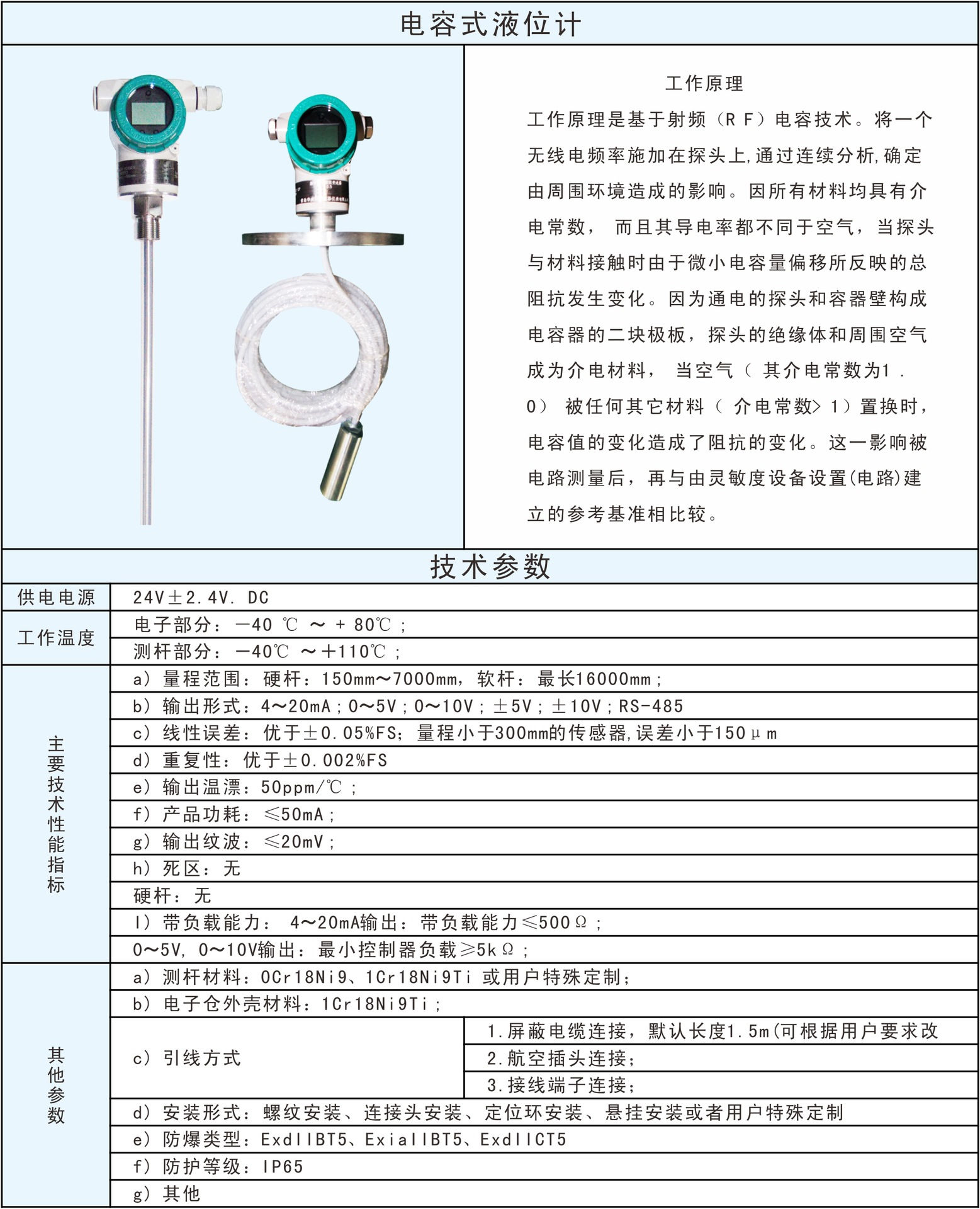 工作原理是基于射頻(R F)電容技術。將一個無線電頻率施加在探頭上,通過連續(xù)分析,確定由周圍環(huán)境造成的影響。因所有材料均具有介電常數(shù),而且其導電率都不同于空氣,當探頭與材料接觸時由于微小電容量偏移所反映的總阻抗發(fā)生變化。因為通電的探頭和容器壁構成電容器的二塊極板,探頭的絕緣體和周圍空氣成為介電材料,當空氣(其介電常數(shù)為1 . 0)被任何其它材料(介電常數(shù)> 1)置換時,電容值的變化造成了阻抗的變化。這一影響被電路測量后,再與由靈敏度設備設置(電路)建立的參考基準相比較。